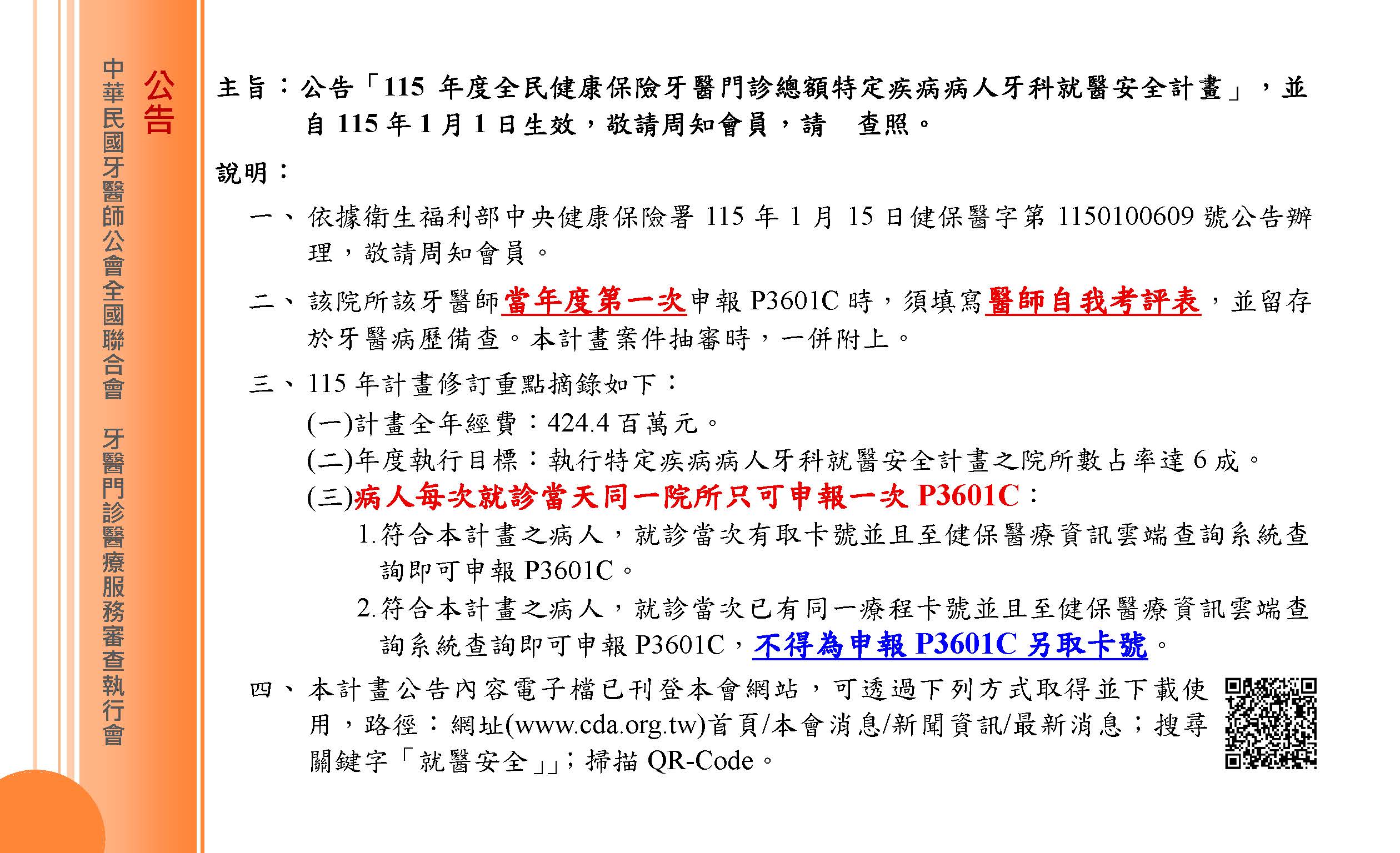 健保專區 牙醫師實用手冊 2025實用手冊下載連結 特定疾病病人牙科就醫安全計畫(P3601C)相關 牙醫師需先參加教育訓練課程方可申報特定疾病病人牙科就醫安全計畫(P3601C),請參閱以下說明: 計畫總覽及公告事項 115年度計畫詳情 雲端藥歷之回溯性審查 教育訓練課程 教育訓練課程APP報名 常用文件下載 該院所該牙醫師當年度第一次申報「特定疾病病人牙科就醫安全」(P3601C)時,須填寫特定疾病病人牙科就醫安全計畫醫師自我考評表,並留存於牙醫病歷備查。本計畫案件抽審時,一併附上。 115年新版自我考評表 諮詢單