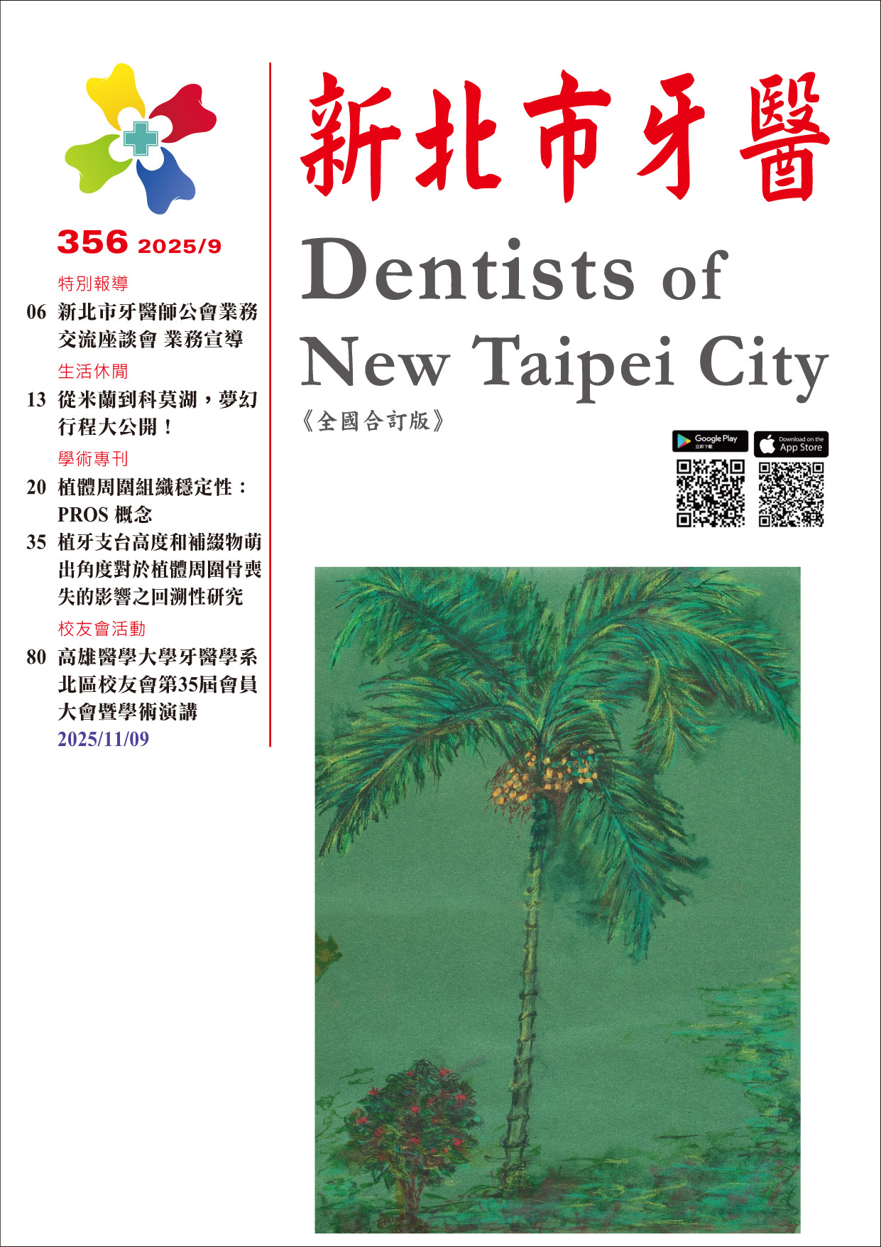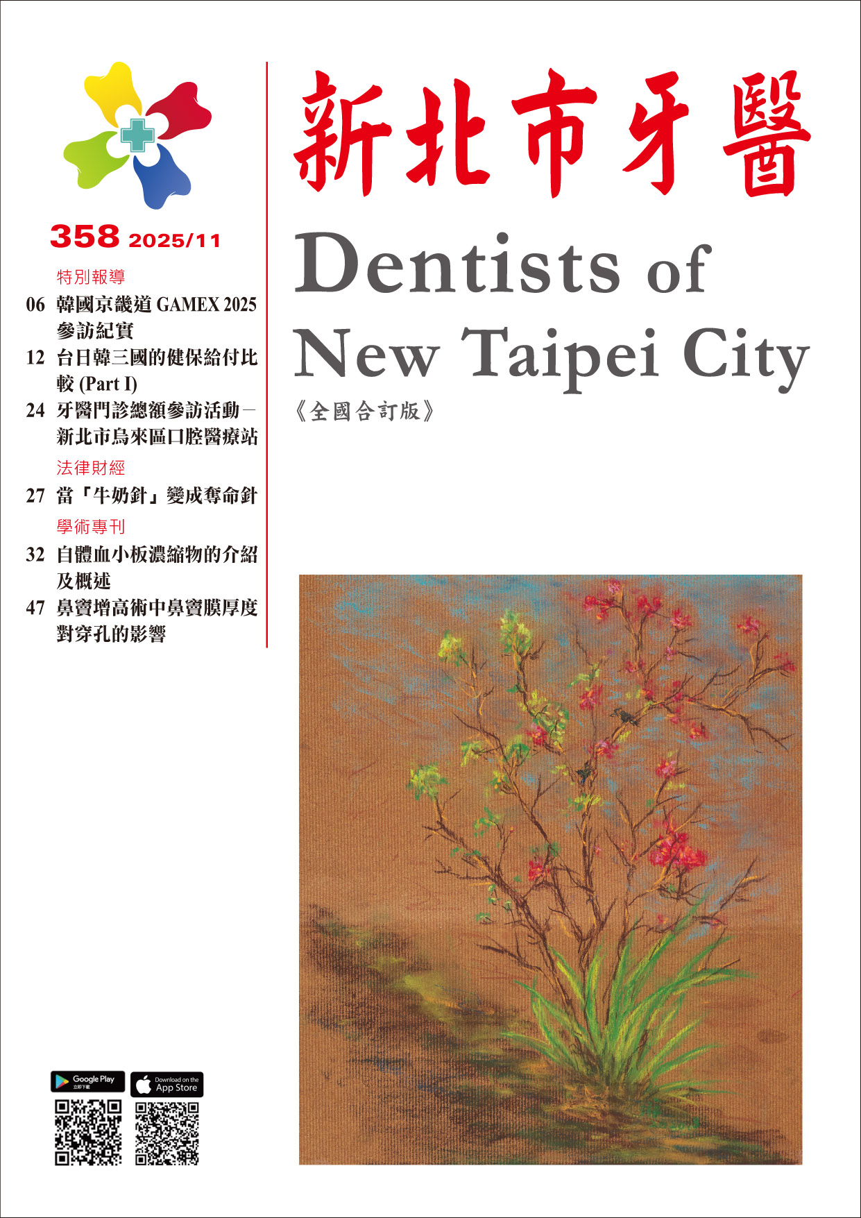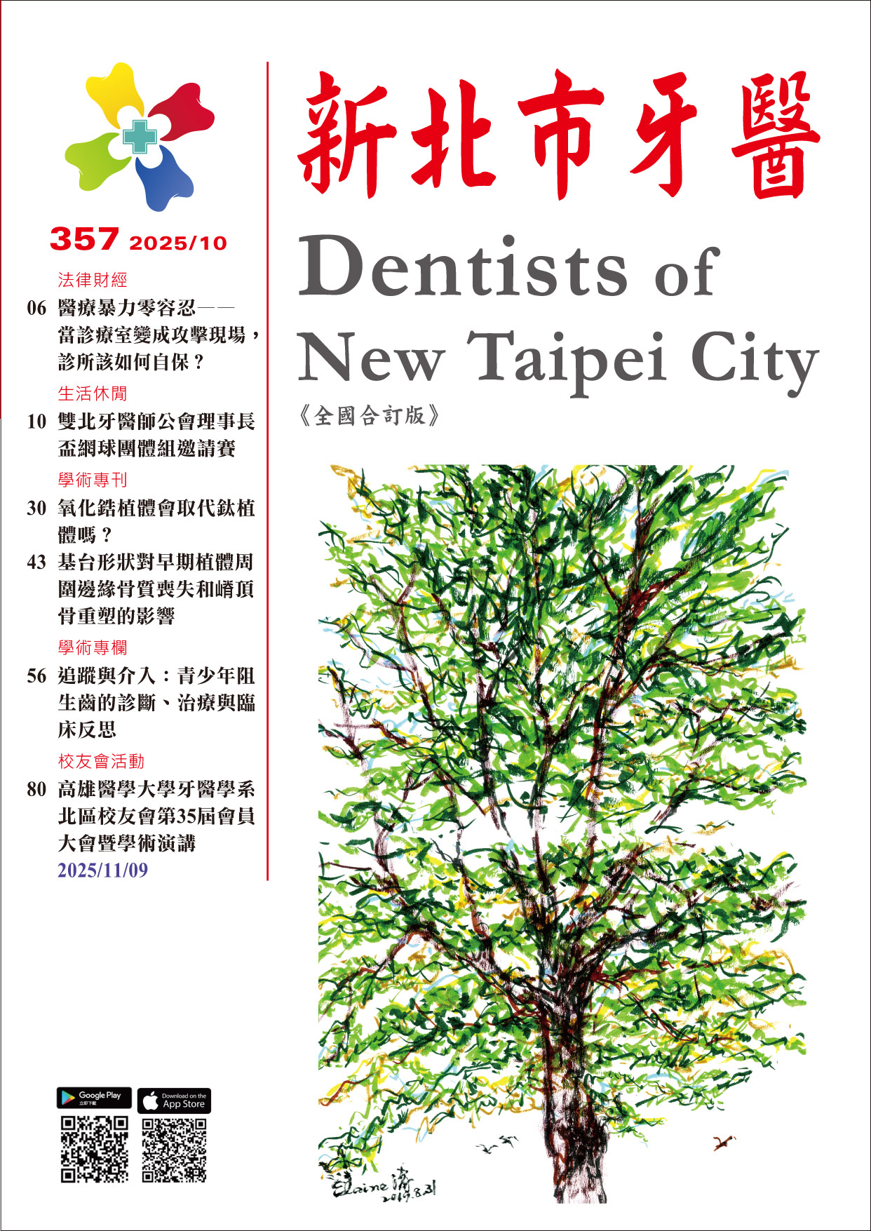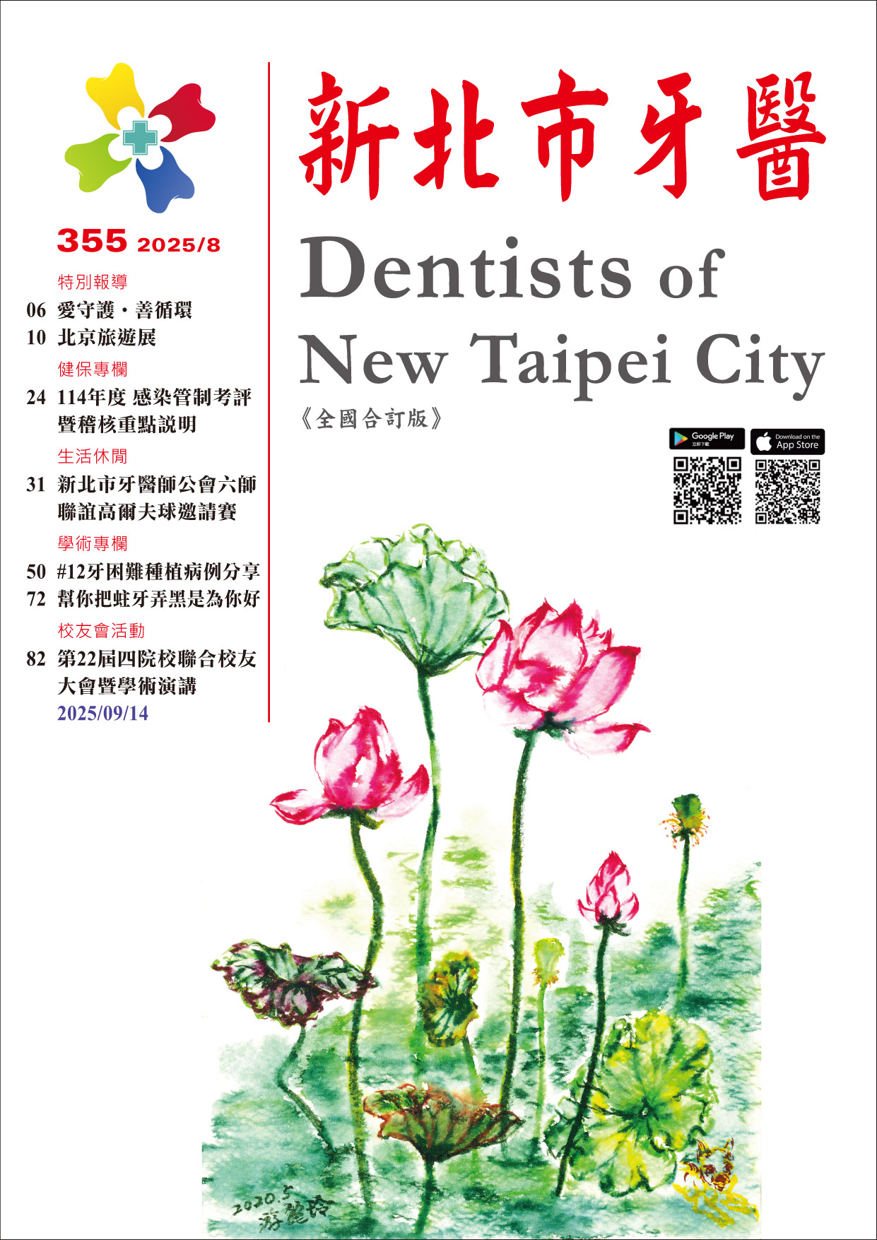 新北市牙醫 本站提供新北市牙醫最新六期雜誌,如欲購買其他期月刊,請聯絡新北市牙醫師公會 2025 11月刊-358期 2025 10月刊-357期 2025 9月刊-356期 2025 8月刊-355期 2025 7月刊-354期 2025 6月刊-353期